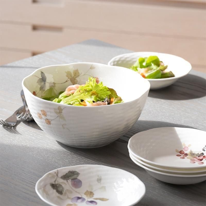 ちょっと深めのサラダボウルは、食卓のセンターピースとしてお似合いです。フルーツやお菓子を盛り付けたり、クラッシュアイスを入れて、ワインクーラーなどにも使えます。ボウルの外側には、カゴメ(篭目)のレリーフを施しました。サラダボウルの正面(内側)にイチゴが描かれており、その反対側にブラックラズベリーが描かれています。食器とおそろいの絵柄の化粧箱に入っているので、ギフトとしてもおすすめです。