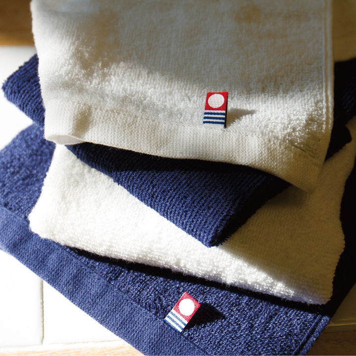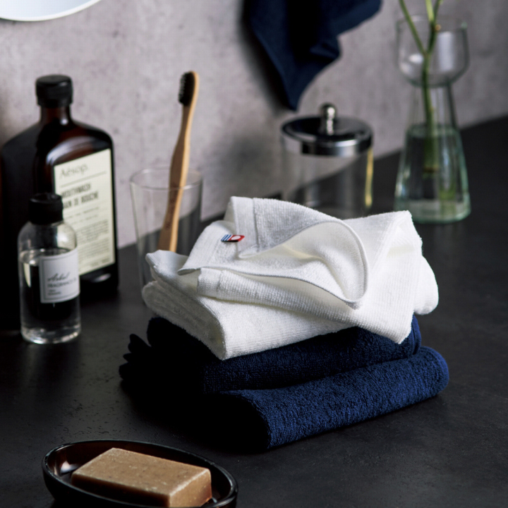 厚すぎず薄すぎない絶妙な厚みに仕上げた、吸水性に優れる今治タオル。清楚な白とシックなネイビーを組み合わせた高級感あふれる今治タオルが優しく肌を包み込んでくれます。