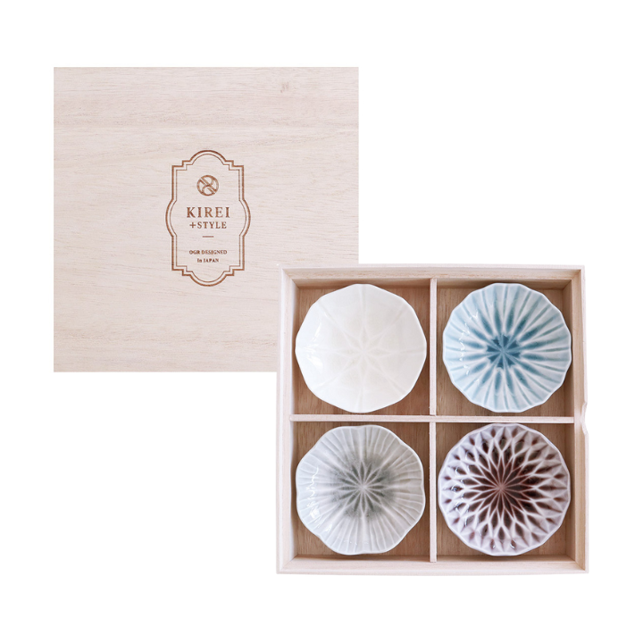 表面が艶やかで美しい色彩を放つ小鉢揃です。カラーは4色、形もすべて違うのでお店のような雰囲気に。胡麻和えやお浸しなど、一品追加したいときにぴったりの小鉢。木箱入りのため、松花堂弁当風にお料理を盛り付けても気分が盛り上がります。大切な方への贈り物にもおすすめ。