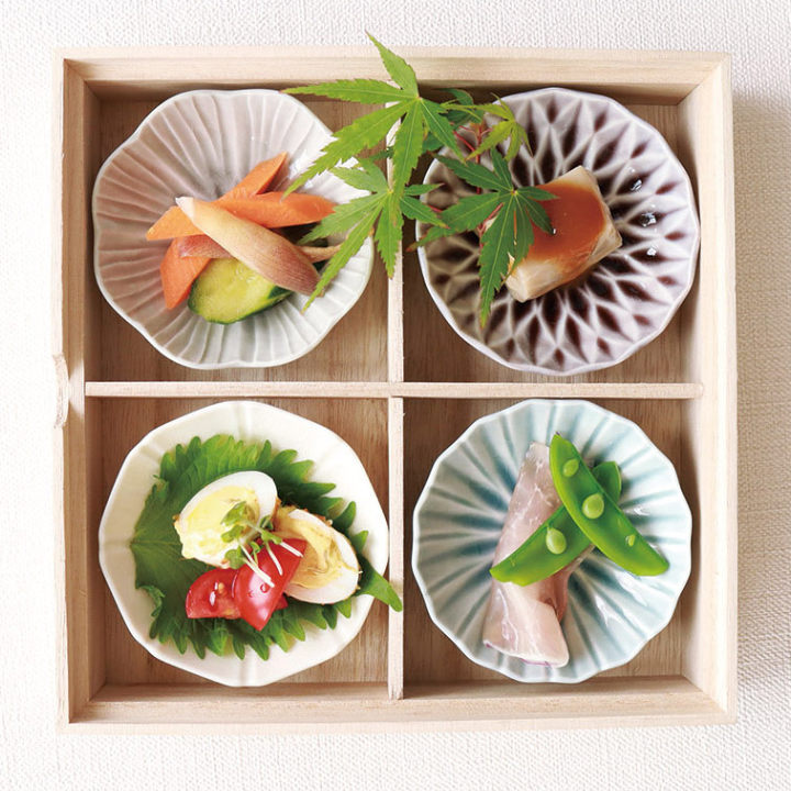 表面が艶やかで美しい色彩を放つ小鉢揃です。カラーは4色、形もすべて違うのでお店のような雰囲気に。胡麻和えやお浸しなど、一品追加したいときにぴったりの小鉢。木箱入りのため、松花堂弁当風にお料理を盛り付けても気分が盛り上がります。大切な方への贈り物にもおすすめ。