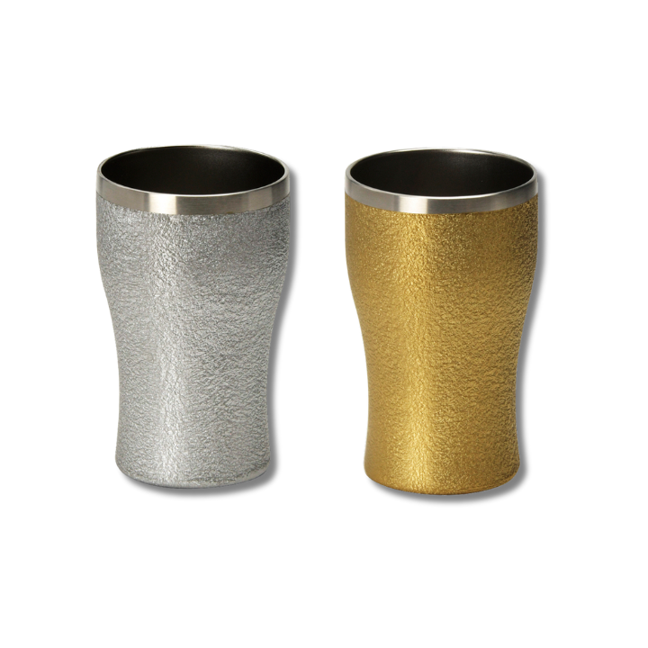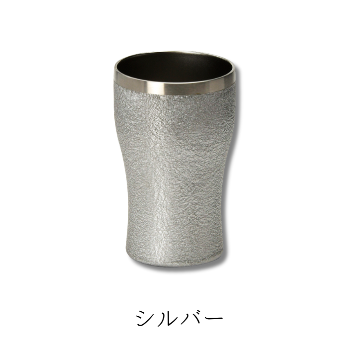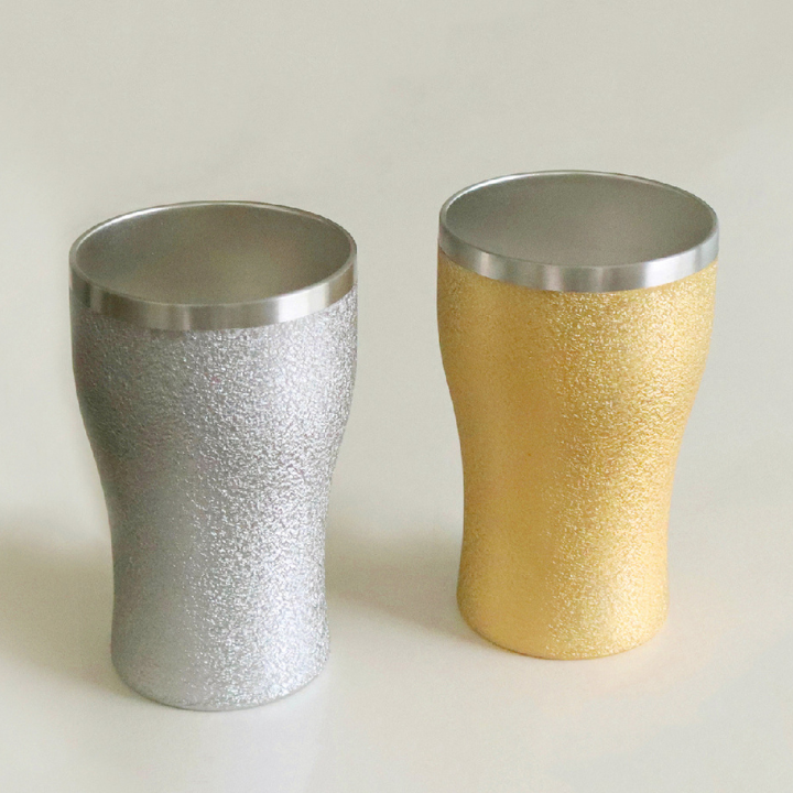 金銀に輝く贅沢な質感のステンレス製真空二層タンブラー。持ちやすく手になじむ、くびれのあるフォルムとなっています。
