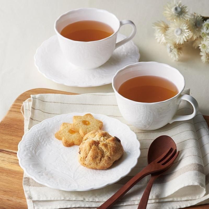 イギリスで長い歴史をもつ高級レース、ホニトンレースの美しく繊細な模様を器にあしらいました。西洋では、レースには「魔除け」、モチーフのカサブランカには「感謝・無垢・純粋」、バタフライには「変化・喜び」の意味があります。3つの幸せのシンボルが、お祝いごとにぴったりです。