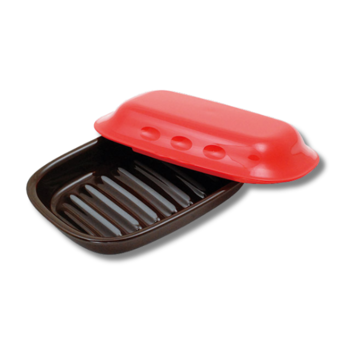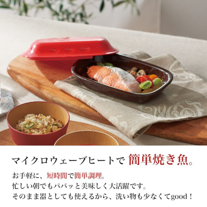食材をプレートにのせて電子レンジでチンするだけで、簡単に時短・焼き調理が行えます。フタをして調理するので、調理中の庫内の汚れを防ぎます。20種類の専用レシピ付。
